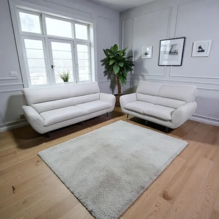 מערכת ישיבה 2+3 אלגנטית ויפיפיה, מרופדת בבד רחיץ ונעים למגע, ספה מודרנית ונוחה בטירוף במבחר רחב של בדים וגוונים. שלד הספה מעץ מלא. מושבים מחוזקים ברצועות גומי אלסטיות, כריות מושב וגב עשויות מספוג איכותי אשר מעליהם פוך נוצות לרביצה מושלמת, רגליים ניקל מודרניות.
