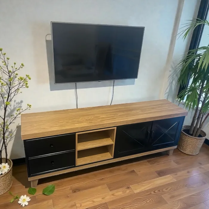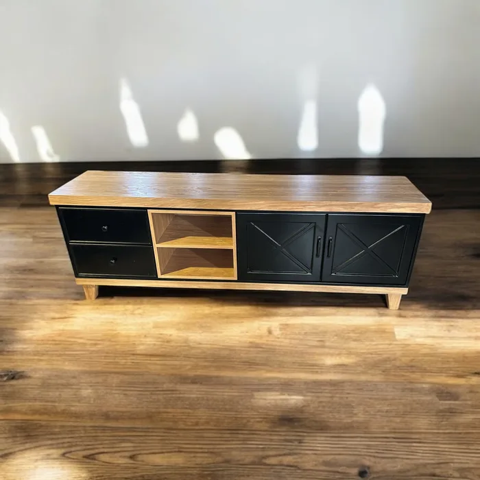 המזנון עומד על רגלי מתכת שחורות יציבות ומינימליסטיות, המעניקות לו מראה מרחף ויוקרתי. אידיאלי לטלוויזיה, לאחסון ולשדרוג מראה הסלון.