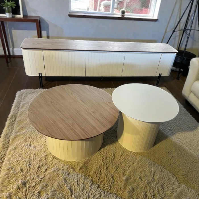 מזנון יוקרתי בעל שילוב מרהיב של עיצוב נקי עם נוכחות חמימה. החזיתות עשויות עץ בגימור פסי–ריבוד (פלוטים) המוסיפים עומק וטקסטורה, ומסגרת שמדגישה את הקווים האלגנטיים של הרהיט.