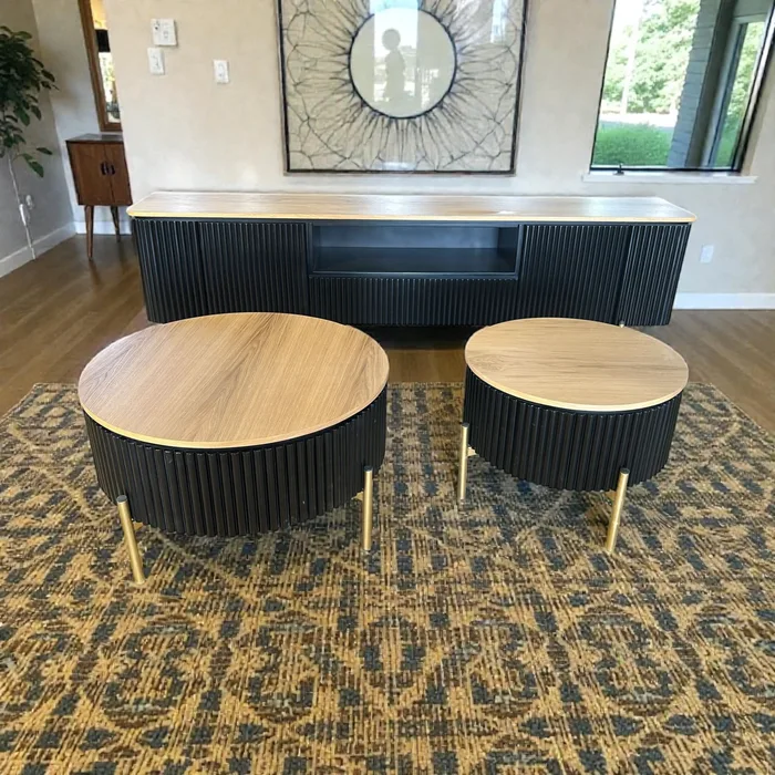 מזנון יוקרתי בעל שילוב מרהיב של עיצוב נקי עם נוכחות חמימה. החזיתות עשויות עץ בגימור פסי–ריבוד (פלוטים) המוסיפים עומק וטקסטורה, ומסגרת לבנה שמדגישה את הקווים האלגנטיים של הרהיט.