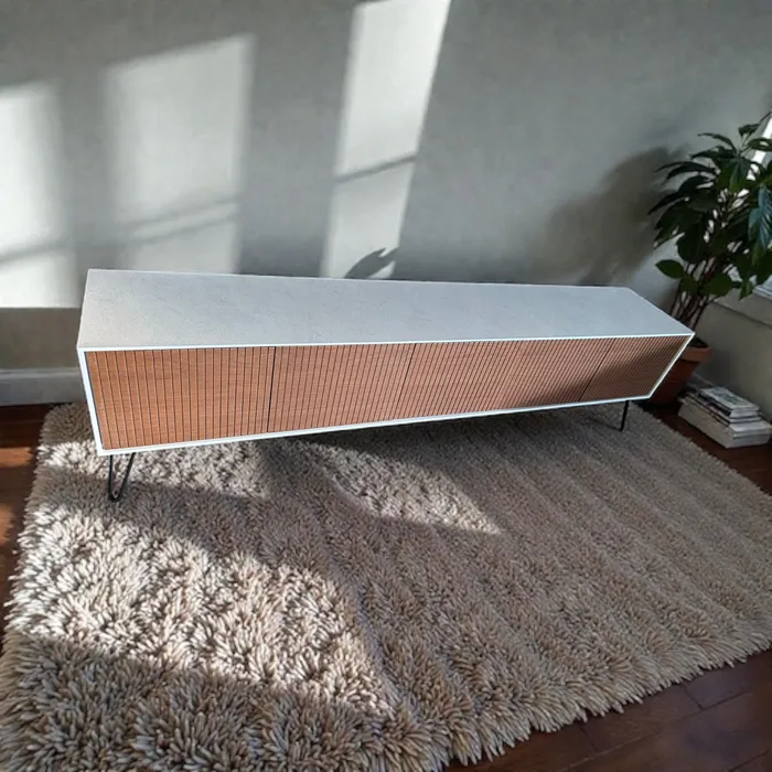 מזנון יוקרתי בעל שילוב מרהיב של עיצוב נקי עם נוכחות חמימה. החזיתות עשויות עץ בגימור פסי–ריבוד (פלוטים) המוסיפים עומק וטקסטורה, ומסגרת שמדגישה את הקווים האלגנטיים של הרהיט.